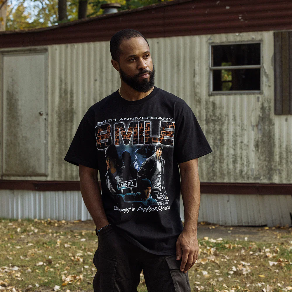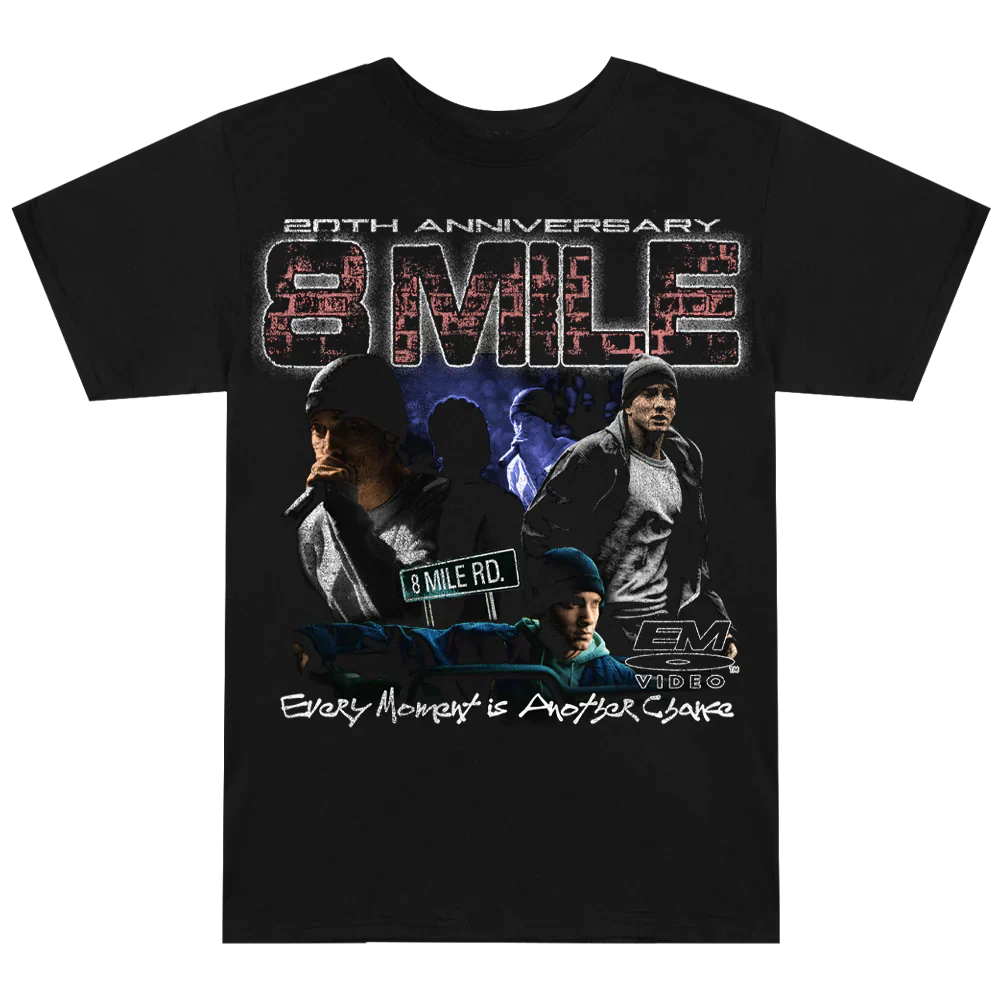 Celebrate the 20th anniversary of 8 Mile, the iconic film that helped define Eminem’s career, with this vintage-inspired t-shirt. Featuring a bold graphic design that commemorates the landmark movie, this t-shirt blends nostalgia with modern style. Made from soft, premium cotton, it offers comfort and durability, making it a must-have for fans who want to honor the movie’s legacy and its impact on hip-hop culture.