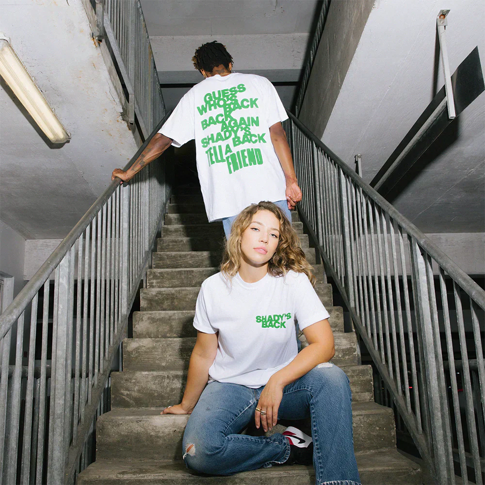 Celebrate the 20th anniversary of The Eminem Show with the “Shady's Back” t-shirt. Featuring a bold graphic with the iconic "Shady's Back" slogan, this t-shirt is a tribute to one of Eminem’s most defining albums. Made from premium cotton, it offers both comfort and durability, making it the perfect way to commemorate this milestone while showing your love for Eminem’s legacy.