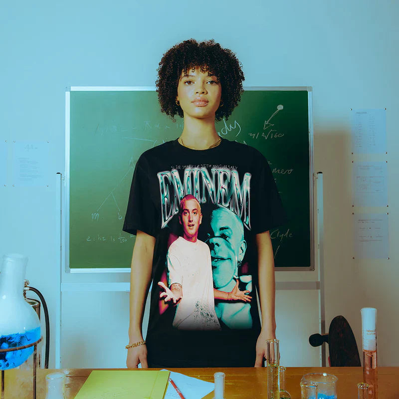 The “SSLP25 Chrome T-Shirt” celebrates the 25th anniversary of The Slim Shady LP, one of Eminem’s most iconic albums. Featuring a sleek chrome graphic, this t-shirt blends bold design with nostalgia, marking a major milestone in Eminem’s career. Made from premium cotton, it offers a comfortable and durable fit, making it perfect for fans who want to commemorate this landmark album in style.